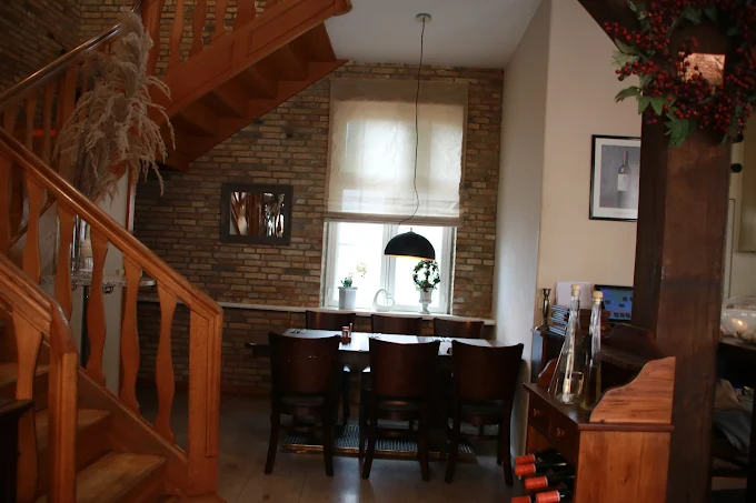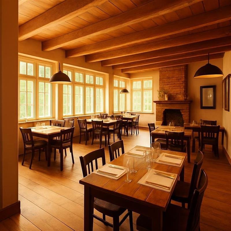 Die großen Fenster sorgen für viel Tageslicht und schaffen eine warme, freundliche Umgebung. Mit einer geschmackvollen Einrichtung und einem rustikalen Charme ist der Raum sowohl funktional als auch stilvoll.
